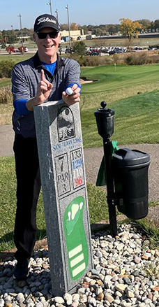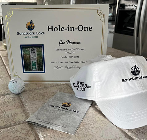 Joe Weaver, playing Sanctuary Lake with Ron Sdao and George Karam scored a hole in one on #7 Par 3, 110 yards using a PW. It was down hill so he was able to watch it all the way…hit the green and rolled into the hole! This is his second one…his first was in April of last year at a links of Crystal Lake.